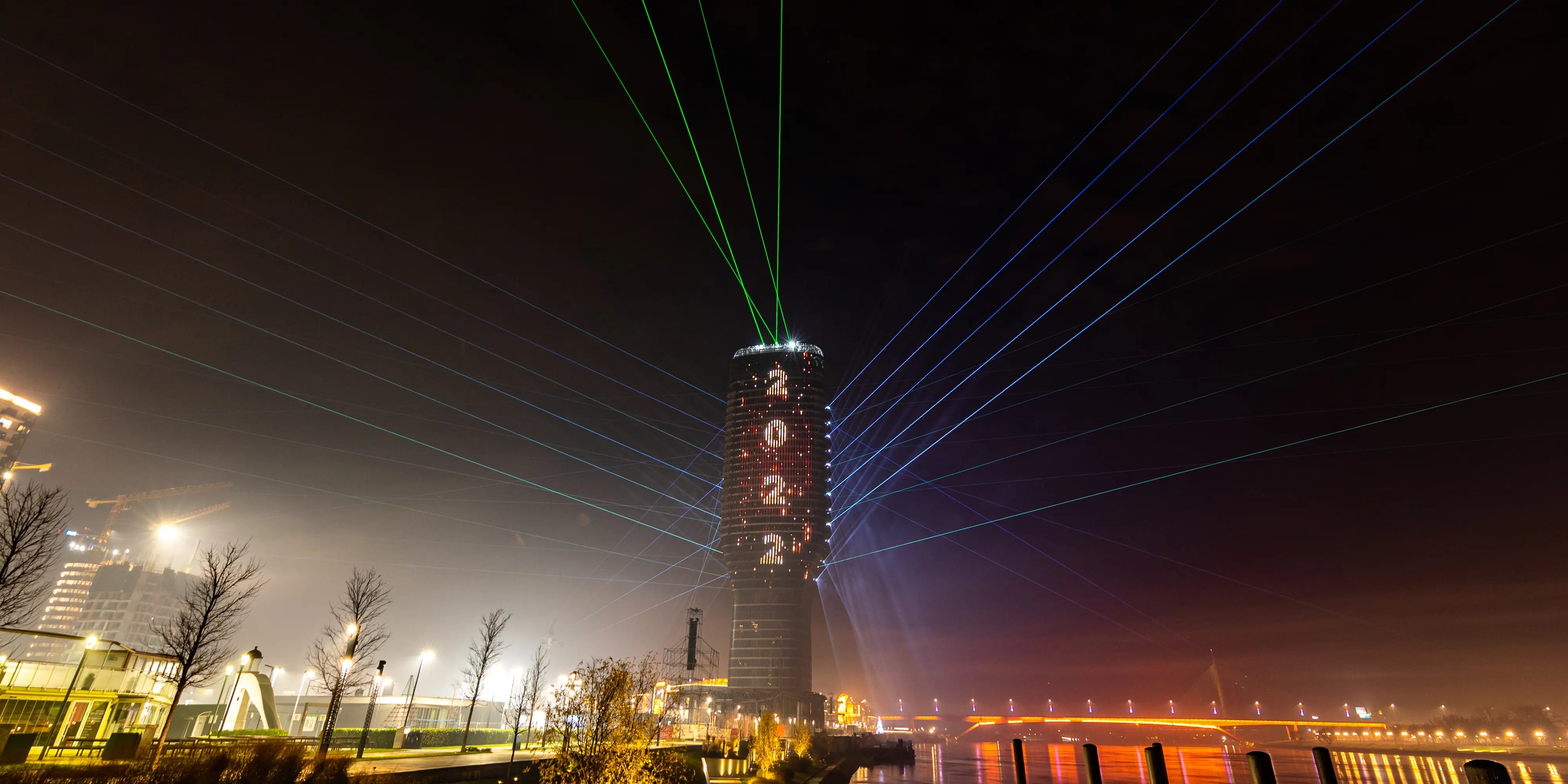 A multimedia laser show is a laser show that brings in other external elements, such as video, audio, standard lighting fixtures, etc. These types of laser shows are typically controlled from a master, like a GrandMA Lighting console, then all the different devices from the show are synched together and output in sync.