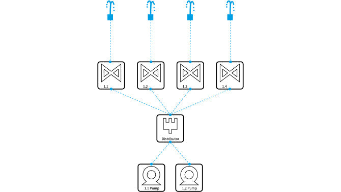 With our innovative concept of Dependencies you can instantly connect fixtures, such as nozzles with valves and valves with pumps. These connections will be used to calculate hydrodynamics and lighting. In reality these connections can be simply compared with real-world installation pipes and cabling.
