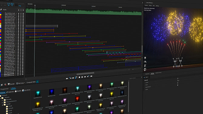 The new Firework simulation system has been fully integrated into the timeline of Depence. It is now possible to quickly create stunning firework shows perfectly synchronized together with all other show elements included in the software. With Depence it is possible to present your customer a full concept for a true multimedia show programmed on a single timeline.